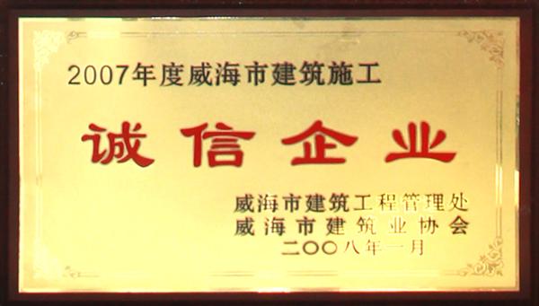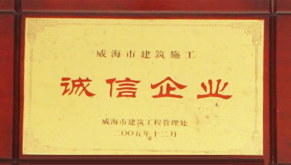 公司連續(xù)八年榮獲威海市“誠信開發(fā)企業(yè)”、“建筑施工誠信企業(yè)”,連續(xù)九年被評為威海市級“守合同重信用企業(yè)”,多次被評為威海市“市級文明單位”、“質(zhì)量管理先進(jìn)企業(yè)”、 “安全管理先進(jìn)企業(yè)”,乳山市“優(yōu)秀企業(yè)”、“先進(jìn)民營企業(yè)”、“納稅明星企業(yè)”,在社會上逐步樹立了誠信、穩(wěn)健的企業(yè)形象。